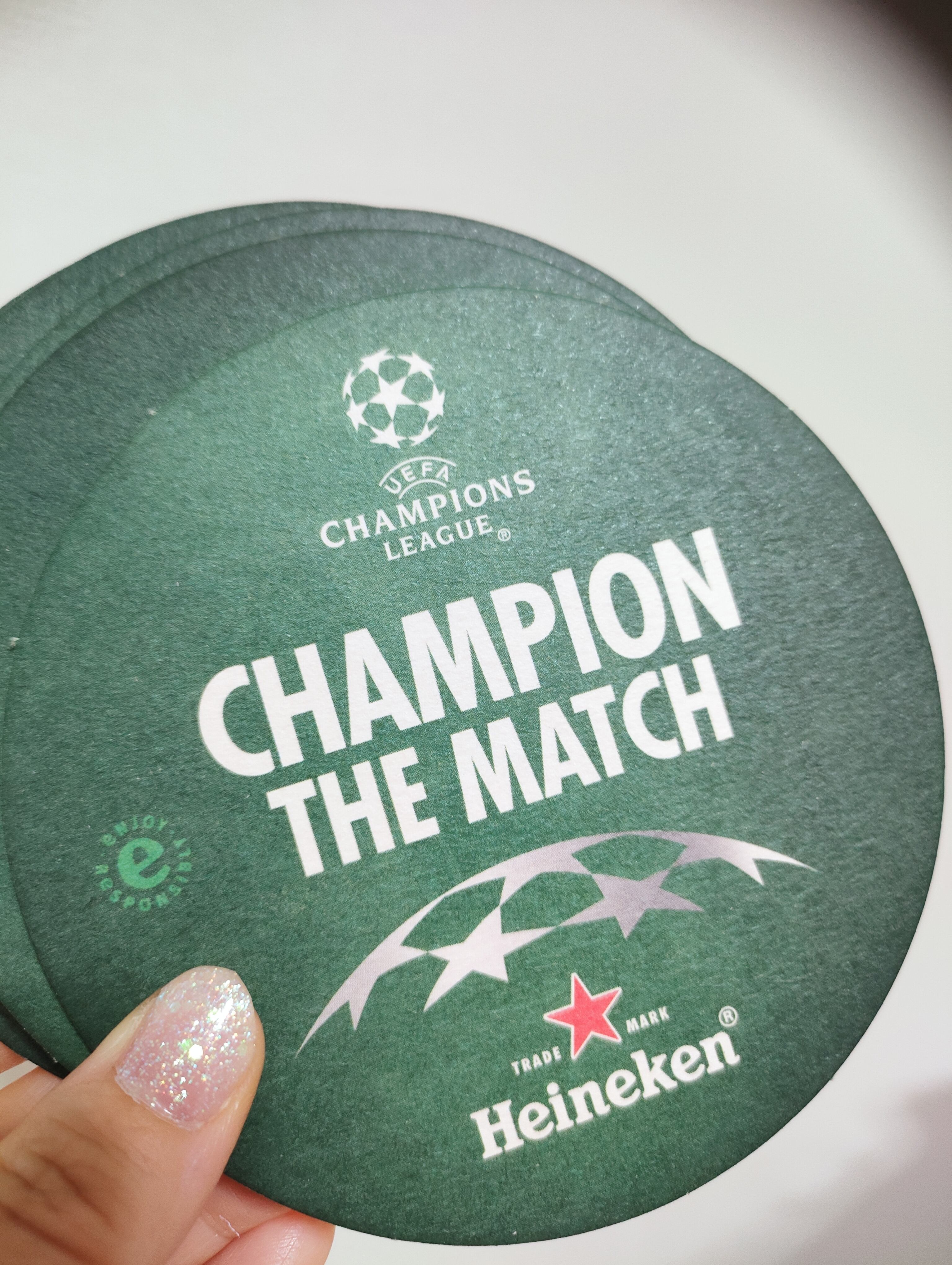 バーなんかでよく目にするハイネケンの業務用ペーパーコースター!!UEFA CHAMPINOS LEAGUEの面と普通のロゴの面とで、表裏のリバーシブル仕様です!